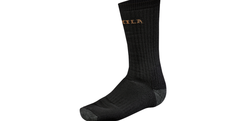 Mycket tjock stickad jakt- och vandringssocka i ull med stötabsorberande sula samt förstärkning i häl och tå.