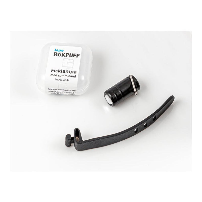 Ficklampan är ett tillbehör för att underlätta användningen av Jape Rökpuff under mörka förhållanden. Ficklampan monteras med ett gummiband längst fram på rökpatronen. Vrid på ficklampans bakre del för att tända.