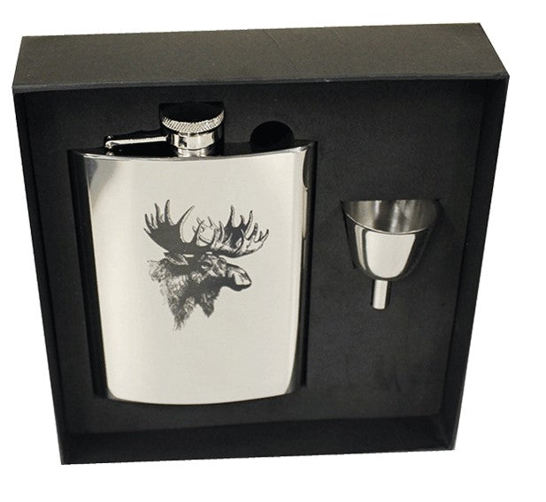 Exklusiv Fickplunta Älg med påfyllnadstratt. Fickplunta Älg tillverkas helt i högglanspolerat rostfritt stål och levereras snyggt förpackad i presentask.