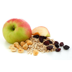 mjölkpulver, havregryn (25%), hasselnötter (10%), socker, russin (10%), veteflingor, äpple (6%),