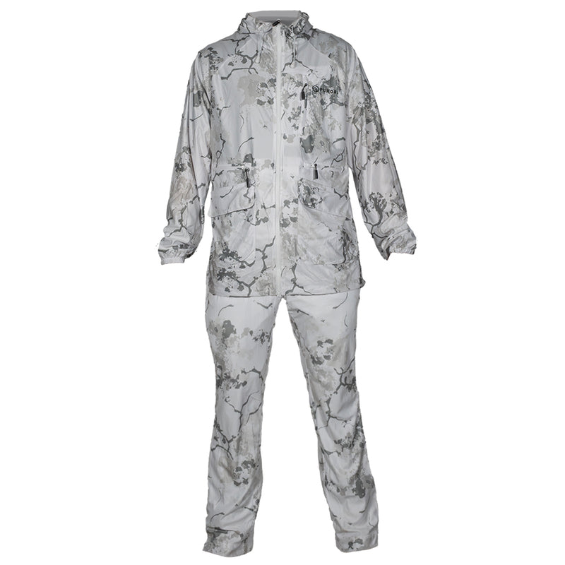 Två-delat överdragsställ från Pumori i pixelcamo, perfekt för vinterns jakter, tillverkad i 100% polyester vilket gör att överdragsdräkten är ljudlös och snö har ingen tendens att fastna i tyget.