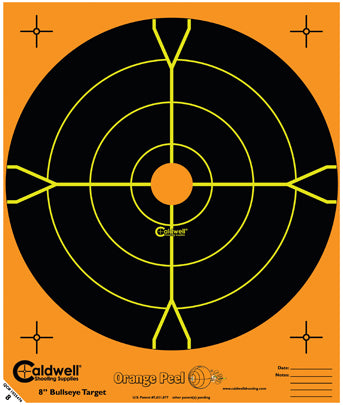 On Target med 8\” Bulls Eye Orange Peel® självhäftande mål av Caldwell®! Orange Peels® låter dig se träffar på och bredvid Bullseye med en tvåfärgad patenterad fling off teknik som gör att dina träffar syns likt färgrika explosioner. Om ditt skott råkar missa bullseye, kommer du att veta exakt vart din kula avvikit ... omedelbart. Du ser enkelt dina träffar på mycket långt avstånd och kan korrigera ditt sikte utan att gå fram.