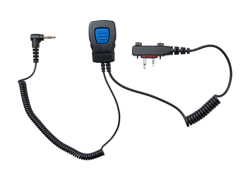 Vinklad skruvkontaktmed stor sändartangent och metall klips ansluts till hörselkåpor.