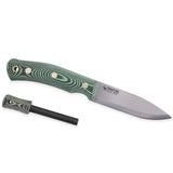 Handtaget är i grön linne micarta. Mellan handtagsskalorna och stålet finns svarta liners för att öka hållbarheten över tid. Handtaget är monterat med kraftiga mässingnitar. Kniven levereras med ett mycket rejält svart knivfodral tillverkat i 3mm tjockt vegetabiliskt garvat läder. Knivslidan har en extra bred bältesögla, en öppning i botten för vätska och ett hål för en förankringsrem.