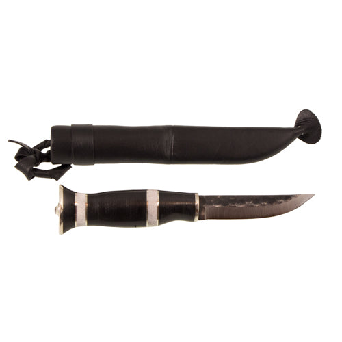 Kniv med skaft i läder, renhorn och metall. 9,5 cm knivblad i kolstål, totallängd 20 cm.