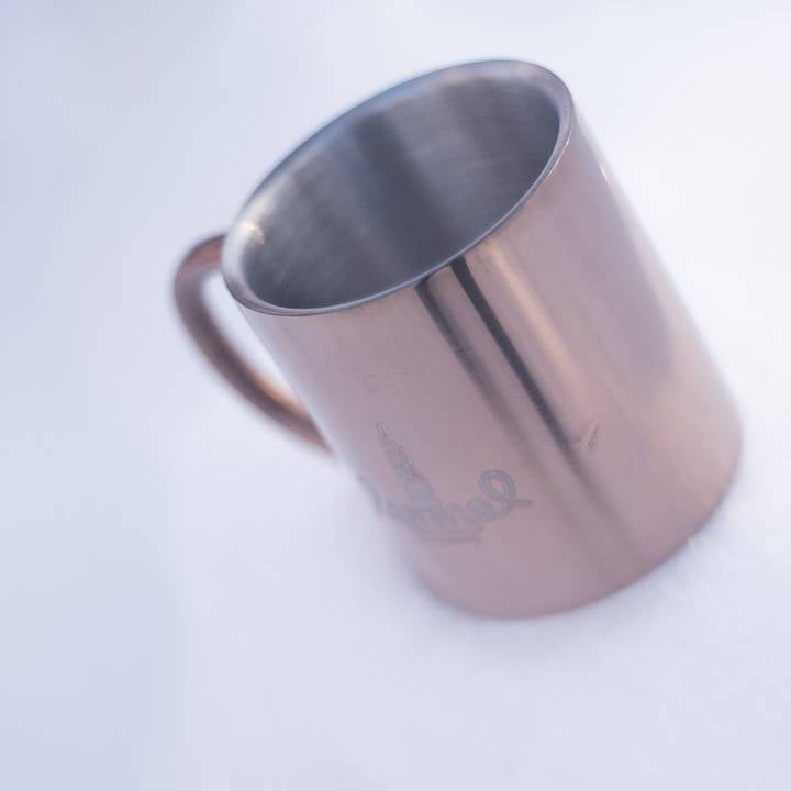 Denna med utsidan i polerat högkvalitativ kopparlegering, resten av muggen är i rostfritt stål. Håller drycken varm eller kall under samtliga årstider. Volym 220 ml. Kommer i en tygpåse som skyddas din daug mot vassa ting och hårda människor.