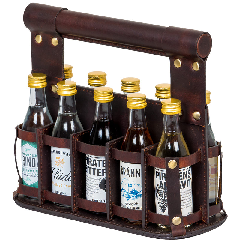 Tillverkad i äkta skinn med plats för 10 st snapsflaskor.