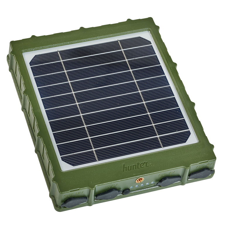 Hunter Solar Panel + har inbyggt 8000mAh / 3,7V litiumbatteri (29,6Wh) som laddas upp under dagen, solcellspanelen monteras med fördel i söderläge för optimalt med dagsljus.