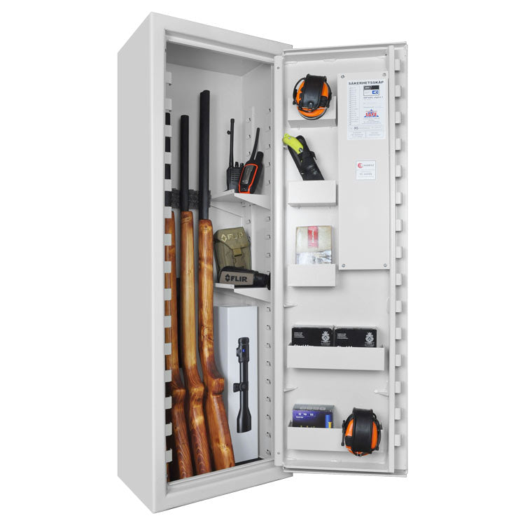 Beskrivning av SP66 vapenskåp: Ett säkerhetsskåp med plats för upp till 6 stycken gevär. Enligt vapenlagen ska säkerhetsskåp som understiger 150 kg förankras, skåpet är lätt att förankra tack vare fyra förankringshål i botten och i ryggen. Vapenskåpet är testat och certifierat enligt SSF3492 och godkänt för 20 poäng, vilket innebär att du i praktiken får förvara 20 stycken gevär alternativt 10 stycken pistoler eller 5 stycken helautomatiska vapen inuti skåpet.