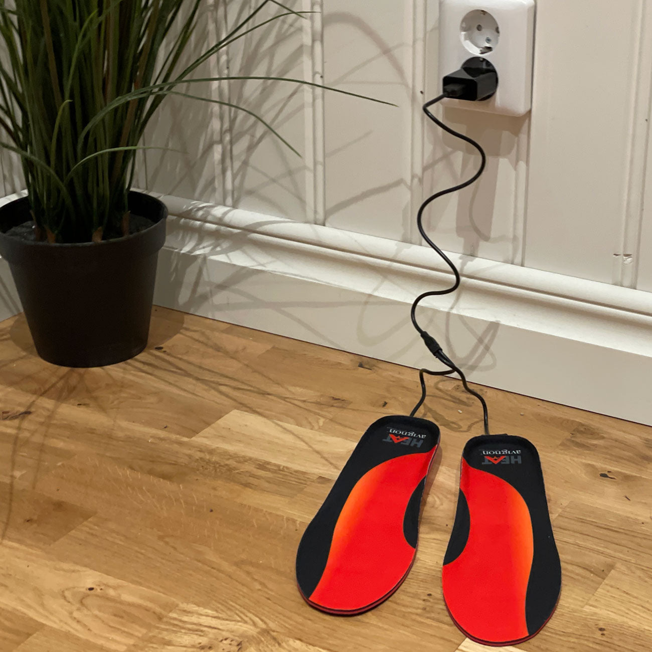 Värmesulor som kan styras med fjärrkontroll, med tre värmenivåer och en drifttid på upp till 6 timmar. Sulorna är stötdämpande och bekväma, och drivs av två integrerade batterier som kan laddas upp med medföljande USB-C och väggkontakt. Sulorna kan klippas till för att passa i dina skor och är enkla att använda och sköta.